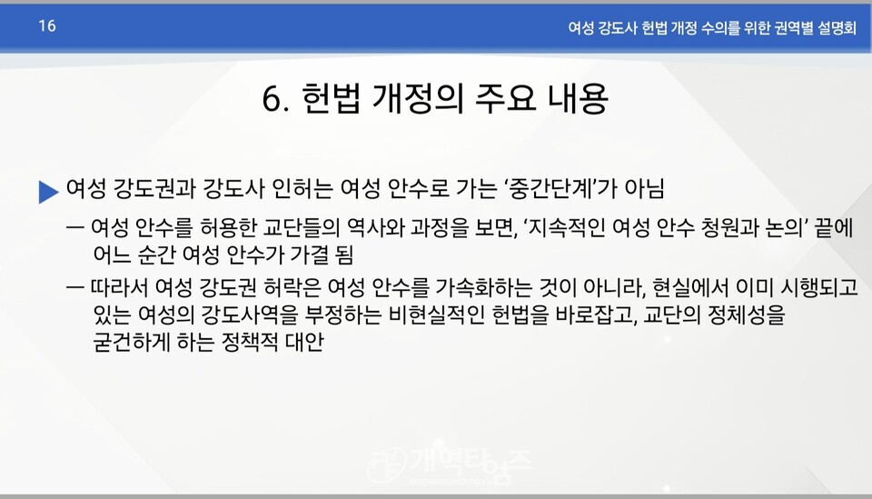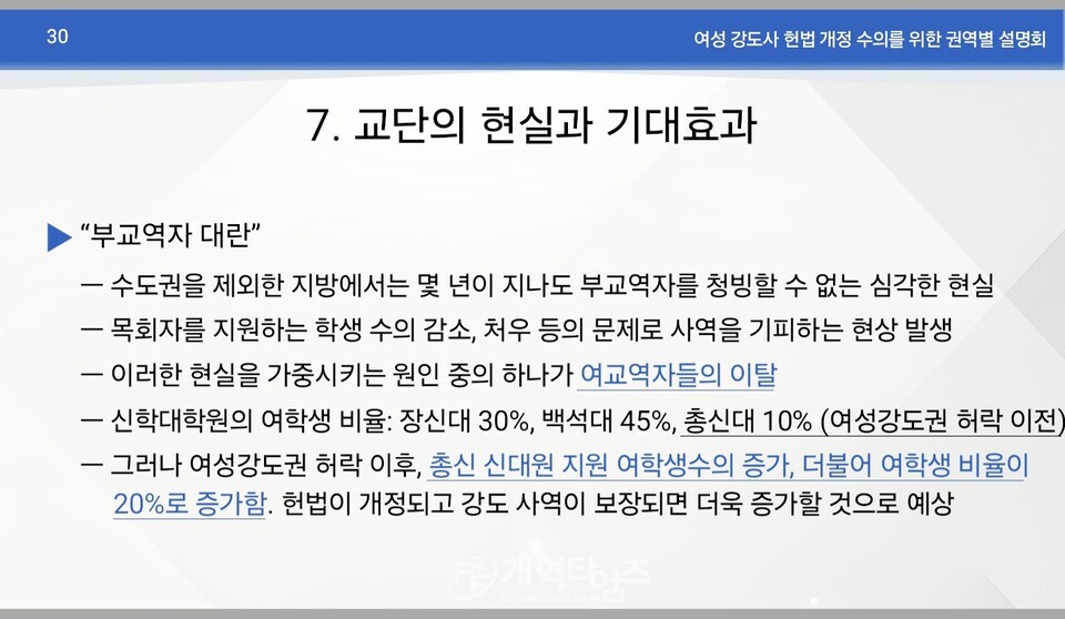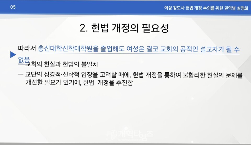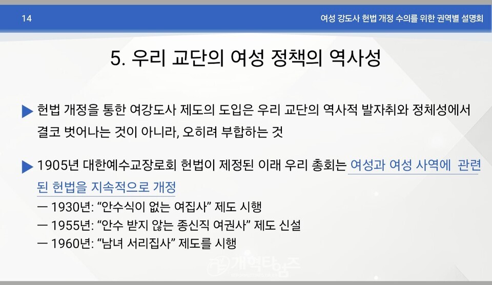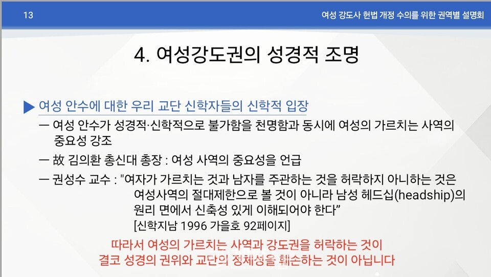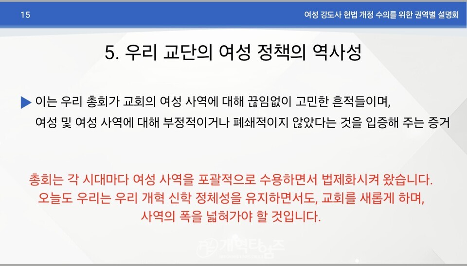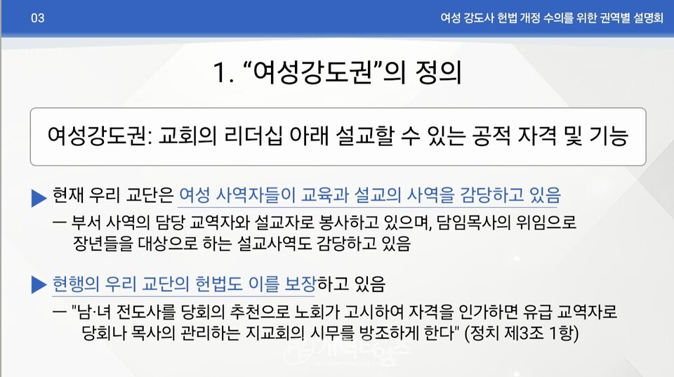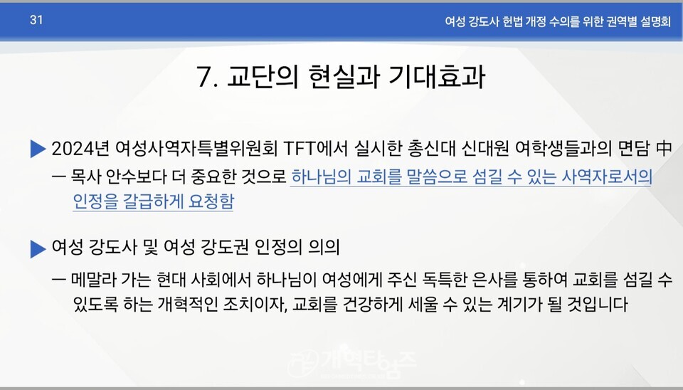 여성 사역자 지위 향상 문제는 합동을 넘어 한국교회 추요 이슈다. '2026년 한국교회 트렌드'란 책에서도 여성 리더십은 해결해야할 시급한 문제로 이를 해결하는 것이 한국교회의 지속적인 성장과 발전에 필수적이라 말하고 있다. 특히 교세감소, 사회적 공신력 상실, 교단과 교회내 분쟁과 갈등이라는 한국교회의 삼중고 위기는 합동 교단의 위기와 맞물려 교회 공신력이 점차 무너지고 교회 쇠퇴가 가속화 되고 있는 상황이다. 또한 근래에는 총신 신대원을 졸업한 적지 않은 여성 인재 리더들이 목사 안수를 받고자 타교단으로 향하는 상황 속에 다시 한번 한국교회의 미래를 위해 여성 강도사 제도에 대해 깊이 논의해야 할 시점이라고 생각한다. 이러한 위기 가운데총회여성사역자위원회가 여성 강도사 헌법 개정 수의를 위한 권역별 설명회를 갖는다는 것은 현재 한국교회 상황에서 시기적절 한 일이라 판단된다 성경은 여성의 가르치는 사역을 부정하지 않으나 현법 개정은 다른 문제 이기에 바라기는 9번의 여성 강도사 제도 필요성에 관한 설명회를 통해 여성사역자들의 지위가 한층더 향상되고 어떻게 나오기를 기대한다."라고 밝혔다.