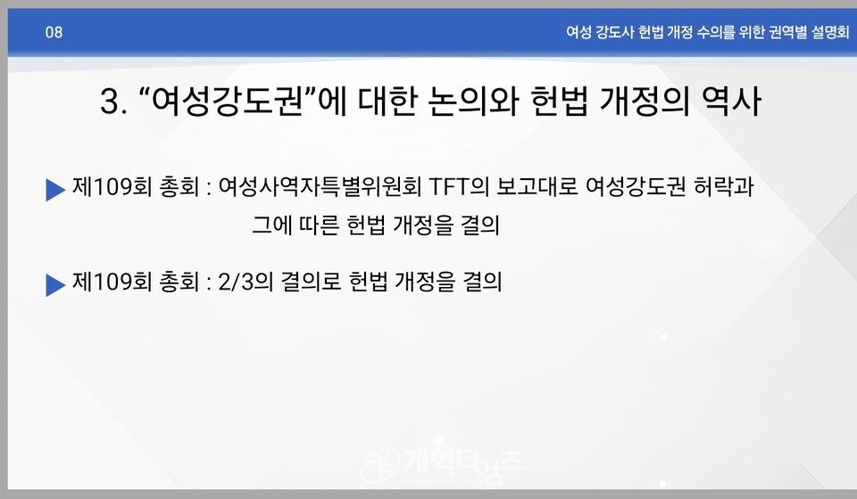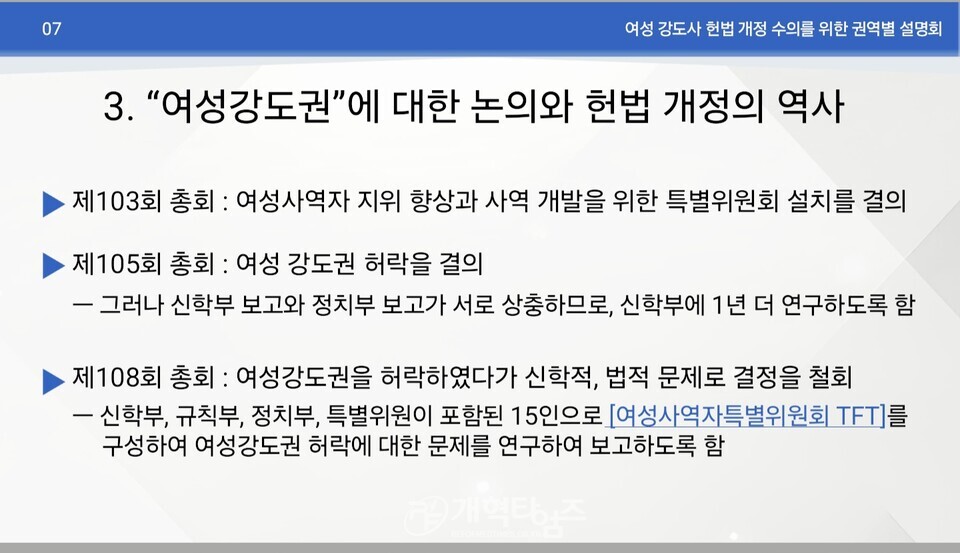제108회 총회에서 여성강도권을 허락하였다가 신학적, 법적 문제로 결정을 철회하고, 이례적으로 신학부, 규칙부, 정치부, 특별위원이 포함된 15인으로 「여성사역자특별위원회 TFT」를 구성하여 여성강도권 허락에 대한 문제를 연구하여 보고하도록 하였다. 제109회 총회에서 여성사역자특별위원회 TFT의 보고대로 여성강도권 허락과 그에 따른 헌법 개정을 결의하였고, 제109회 총회에서는 2/3의 결의로 헌법 개정을 결의하여 오늘에 이르렀다.