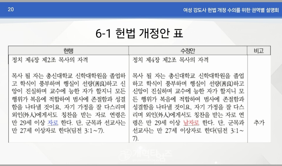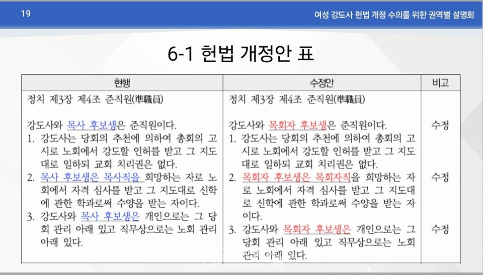 한편 위원회는 헌법 수의를 위한 설명회를 이날 대전 판암장로교회(홍성현 목사)를 시작으로, 2월 9일 화순중부교회(강대용 목사), 2월 12일 이천은광교회(김상기 목사), 2월 26일 전주동부교회(김종철 목사), 3월 3일 대한교회(윤영민 목사), 3월 17일 장성교회(김재철 목사), 3월 19일 신광교회(박성호 목사), 3월 24일 참좋은교회(이윤찬 목사), 3월 26일 초량교회(김대훈 목사) 순서로 전국 9개 지역에서 진행할 예정이다.