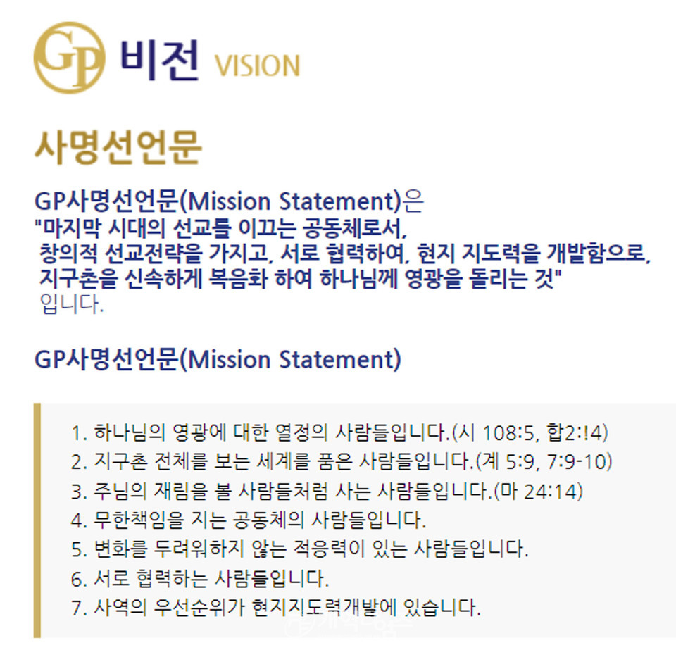 또한 GP선교회는 마지막 선교를 이끄는 선교공동체로서 ①새롭게 시작하는 선교 ②지도력을 양성하는 선교 ③영혼구원에 집중하는 선교 ④희생과 헌신적 삶의 자세 ⑤깊은 영성을 갖춘 선교사 ⑥교회 중심의 선교 ⑦협력과 네트워크 ⑧나눔의 공동체 ⑨종이 되는 선교 ⑩현지 지도력 개발 ⑩지구촌 선교동원 비전 ⑫하나님께 영광을 돌리는 선교를 지향하고 있다.