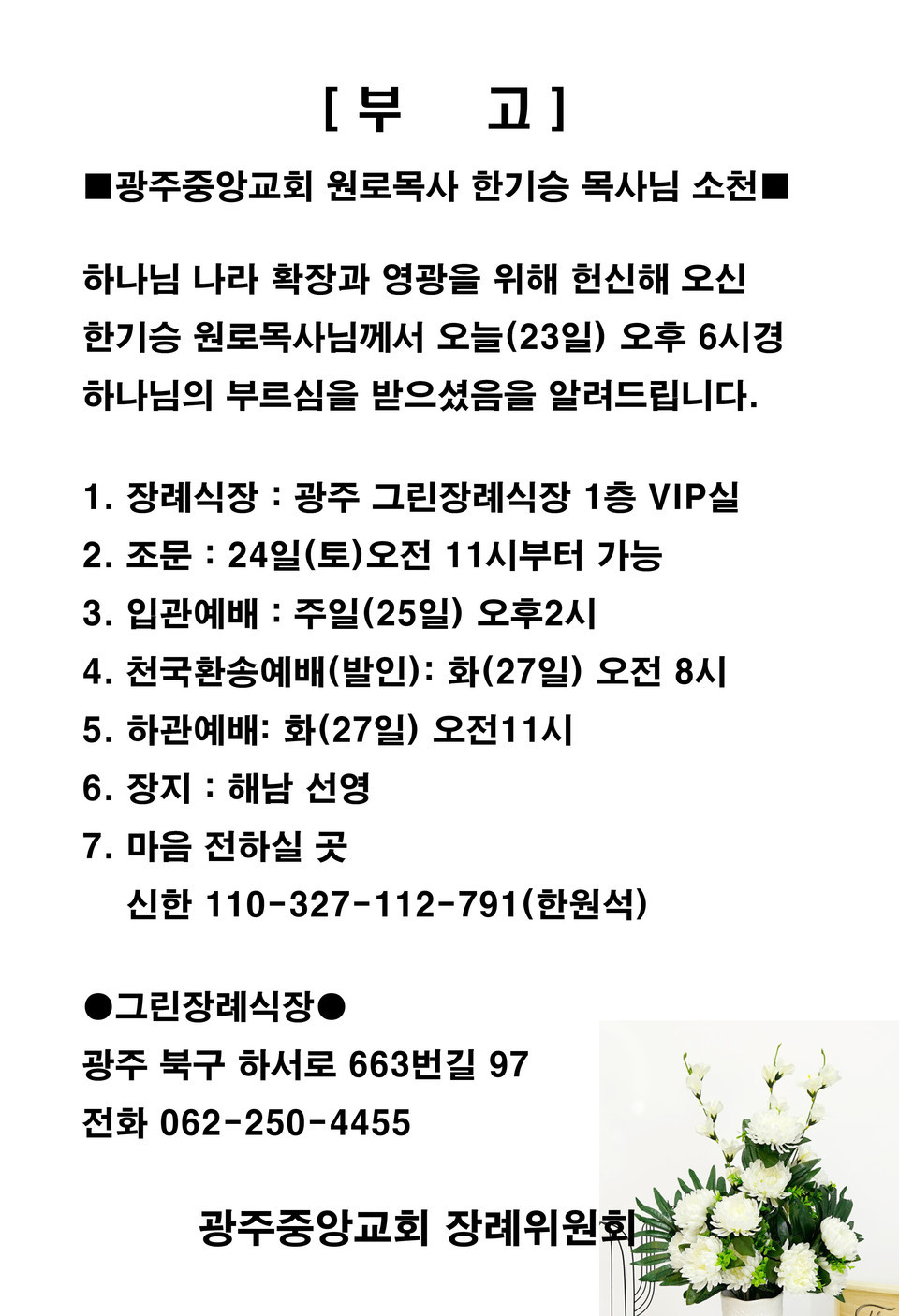 광주중앙교회 원로 목사이며 광주숭일학원 이사장이며 제107회 총회 부총회장 후보였던 故 한기승 목사가 투병 중에 5월23일 저녁 6시 조금 지나 향년 67세로 하나님의 부름을 받았다.