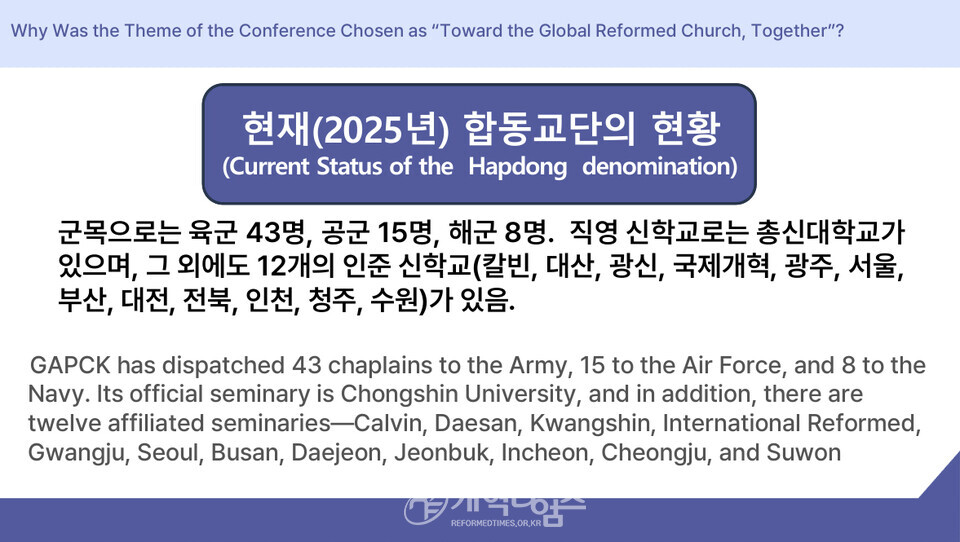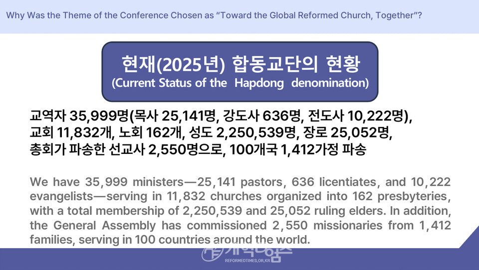 강의 3에서 준비위원장 신종철 목사는 "예장 합동 교단은 세계 개혁주의 교단 가운데 가장 두드러진 부흥과 성장을 이루어, 이제 세계 최대의 개혁주의 교단이 되었다. 2025년 현재 합동 교단은 교역자 35,999명(목사 25,141명, 강도사 636명, 전도사 10.222명), 교회 11,832개, 노회 166개, 성도 2,250,539명, 장로 25,052명을 보유하고 있다. 또한 총회가 파송한 선교사는 2,550명으로, 100개국 1,412 가정에서 사역하고 있으며, 군목으로는 육군 43명, 공군 15명, 해군 8명이 활동하고 있다. 직영 신학교로는 총신대학교가 있으며, 그 외에도 12개의 인준 신학교(칼빈, 대신, 광신, 국제개혁, 광주, 서울, 부산, 대전, 전북, 인천, 청주, 수원)가 있다. 이 모든 결과는 전적으로 하나님의 크신 은혜의 열매이다. 그리고 그 중심에는 개혁주의 신학이 있다. 개혁주의는 하나님 중심, 성경 중심, 교회 중심의 신앙으로 우리 합동 교단의 정체성과 사역의 뿌리가 되어 왔다.