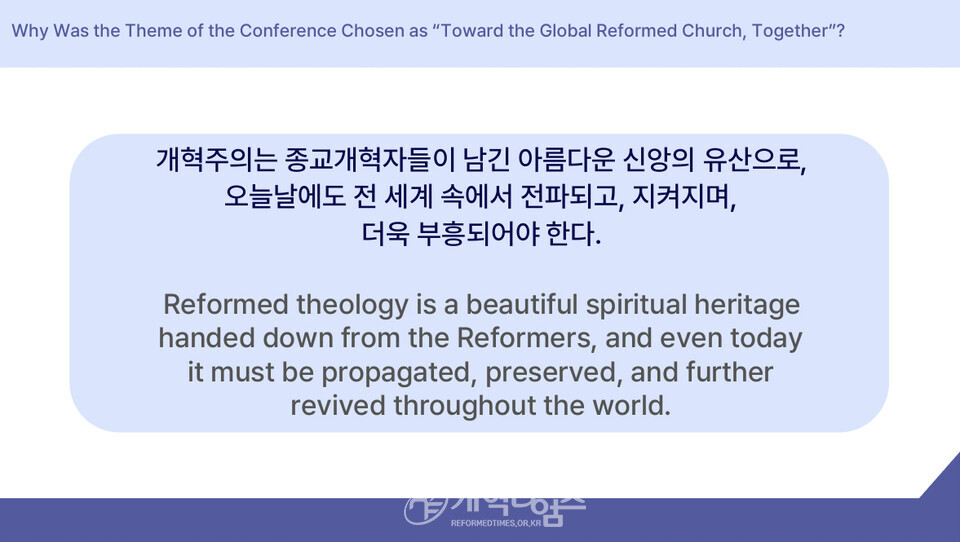 개혁주의는 종교개혁자들이 남긴 아름다운 신앙의 유산으로, 오늘날에도 전 세계 속에서 전파돼고, 지켜지며, 더욱 부흥되어야 한다. 이에 우리 합동 교단은 이미 MOU를 체결한 세계 개혁주의 교단들과 아시아 지역 교회들과 함께, 이 소중한 개혁주의 신학의 가치를 공유하고 확산시키며, 교회와 교단이 질적. 양적으로 함께 성장할 수 있도록 섬기고자 한다. 바로 이러한 취지를 담아 「세계 개혁주의 교단 및 아시아 교회 지도자 대회」가 열리게 됐다"고 밝혔다.
